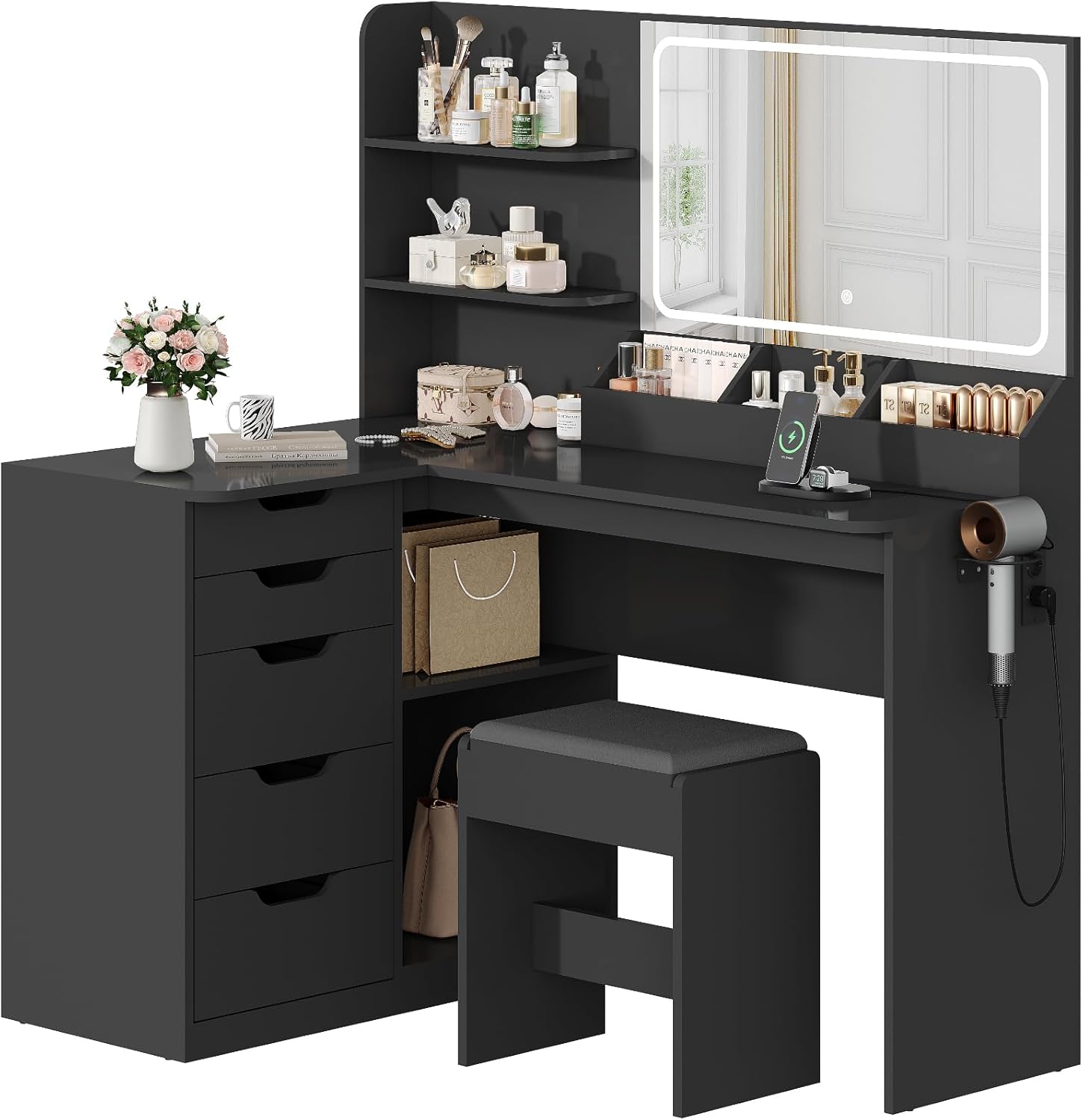 TRIUMPHKEY Coiffeuse avec Grand Miroir LED et Tabouret,Table de Maquillage en L avec Multiprise y Support de Sèche-Cheveux,5 Tiroirs,Cloison de Rangement,Étagères,Coiffeuse Moderne Noir