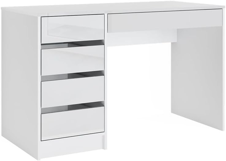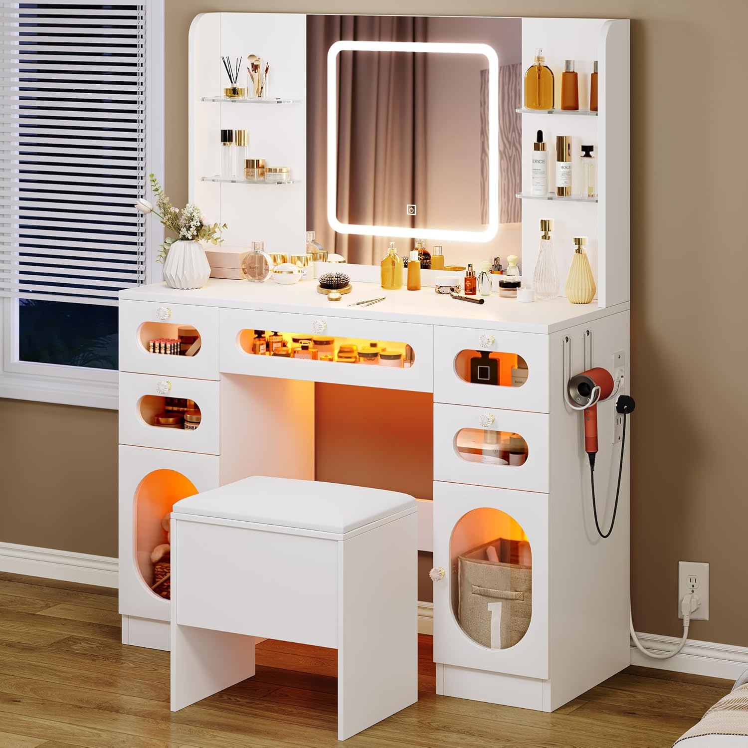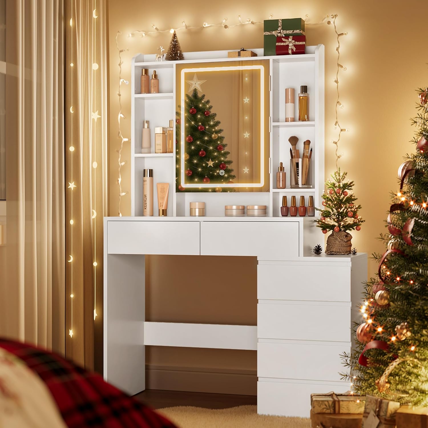 HEXCELEN Coiffeuse avec Grand Miroir LED et Tabouret, Luminosité Réglable, Table de Maquillage en L avec Prise, Coiffeuse avec 5 Tiroirs et Étagères Ouverts, 40 x 120 x 139 cm, Blanc