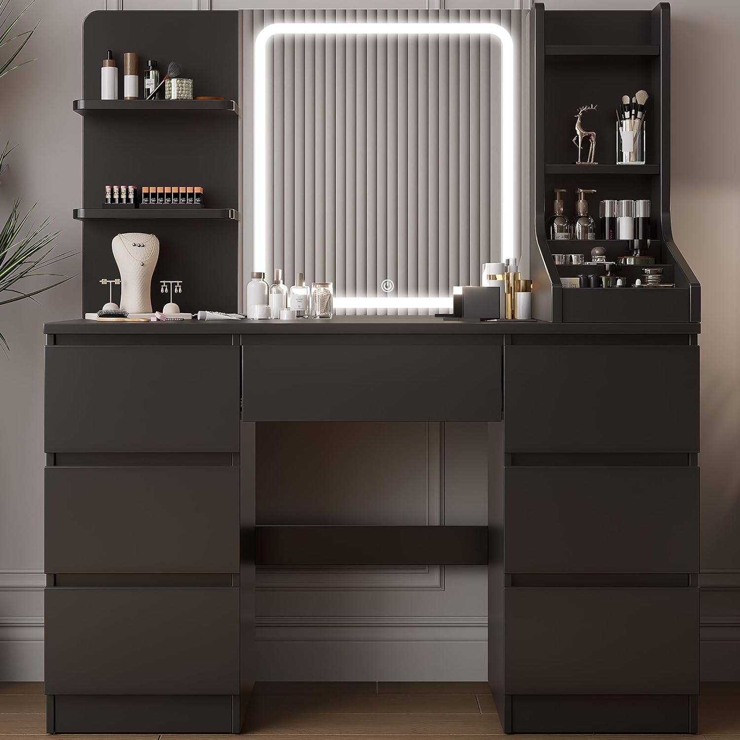 TRIUMPHKEY Coiffeuse avec Miroir LED, Luminosité Réglable, Table de Maquillage avec 4 Étagères et 7 Tiroirs, Coiffeuse Moderne avec Grand Espace de Rangement Noir