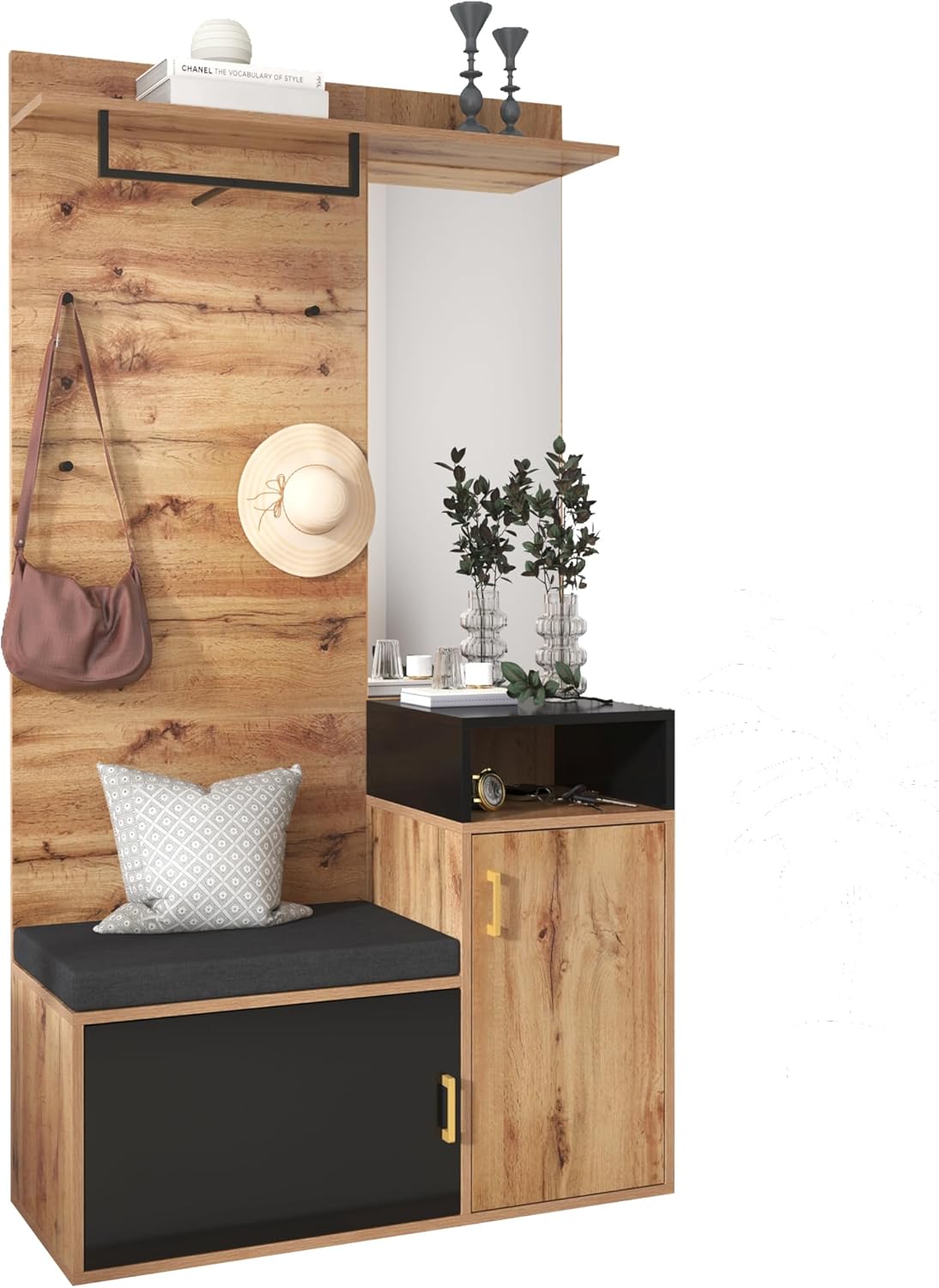 Ensemble de garde-robe moderne avec miroir, banc, armoire à chaussures, porte-manteau mural, étagères de rangement, patères, tringle à vêtements, combinaison de meubles de couloir pour entrée, panneau