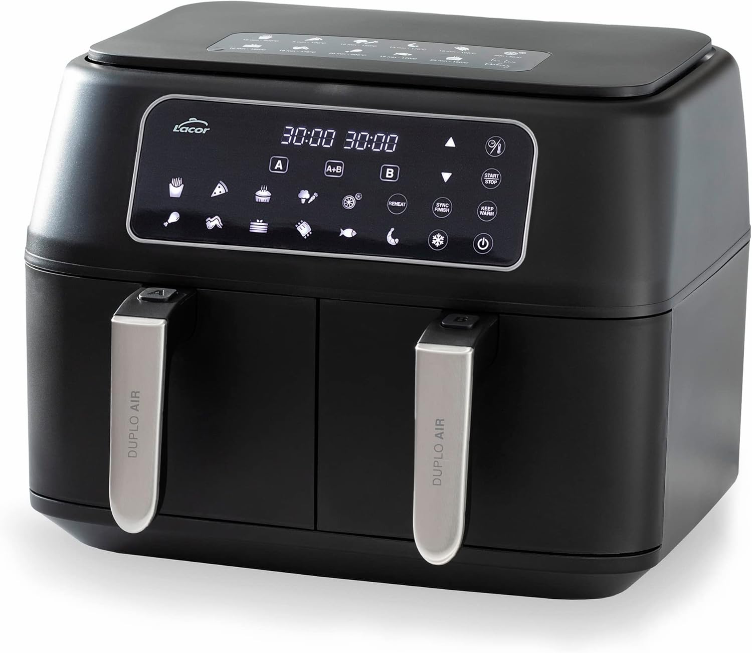 Lacor - 69508 - Friteuse sans huile DuploAir, Friteuse à air avec écran tactile, Panier double, Comprend Livre de recettes, 11 programmes, Fonction déshydratée, Antiadhésif, Grande capacité 9L, 2400 W