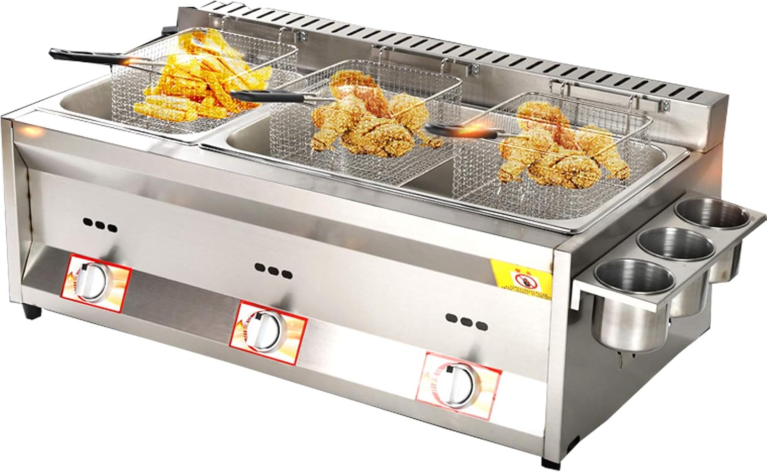 Friteuse épaisse à gaz en acier inoxydable, friteuse à panier à trois cylindres commerciale avec couvercle friteuse de grande capacité pour frire les aliments frites domestiques poulet frit 10L x 3