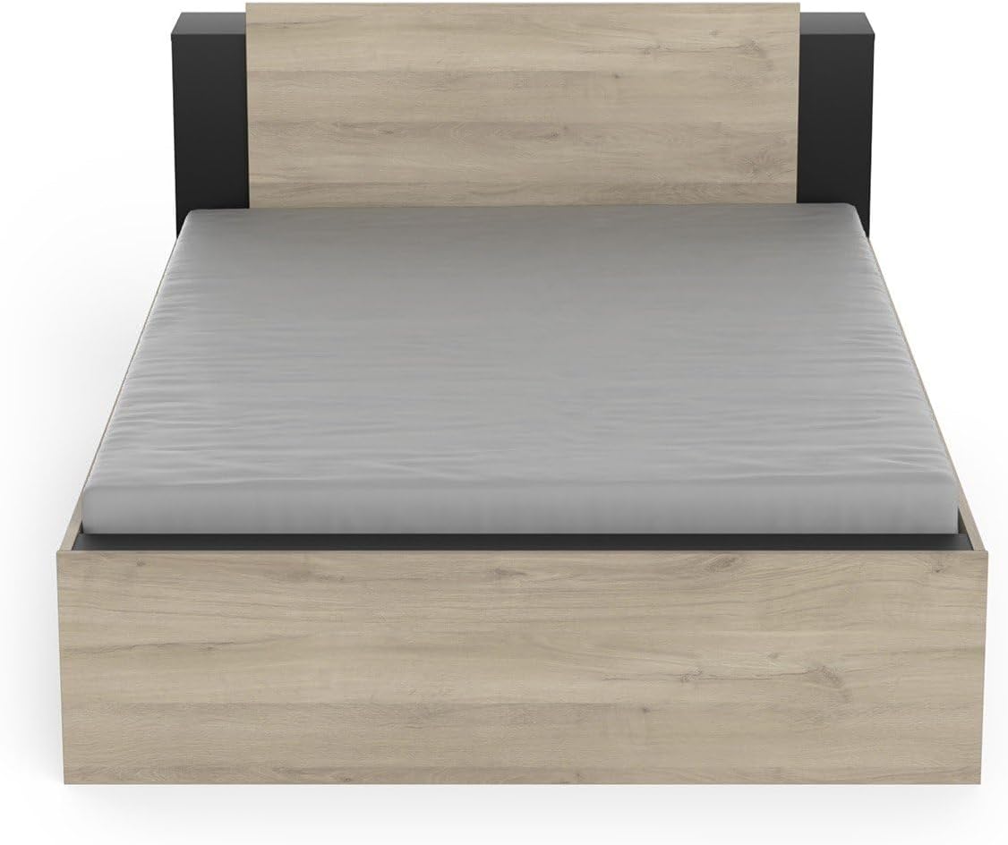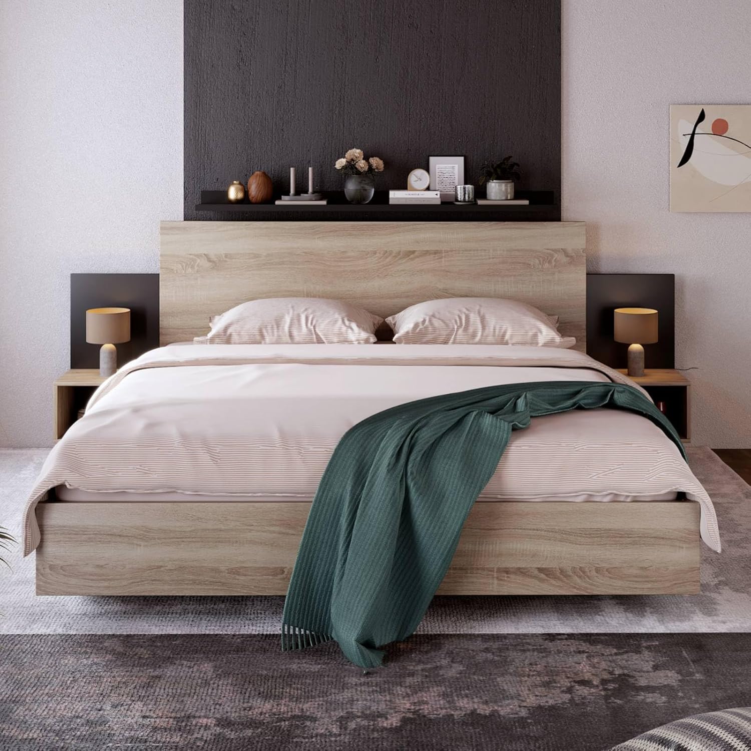 Lit 140 x 190/200 avec Rangement Industriel 2 Tiroirs 2 Niches - Coloris Noir Mat et Chêne Clair - 144,7 x 227 x 87,7 cm