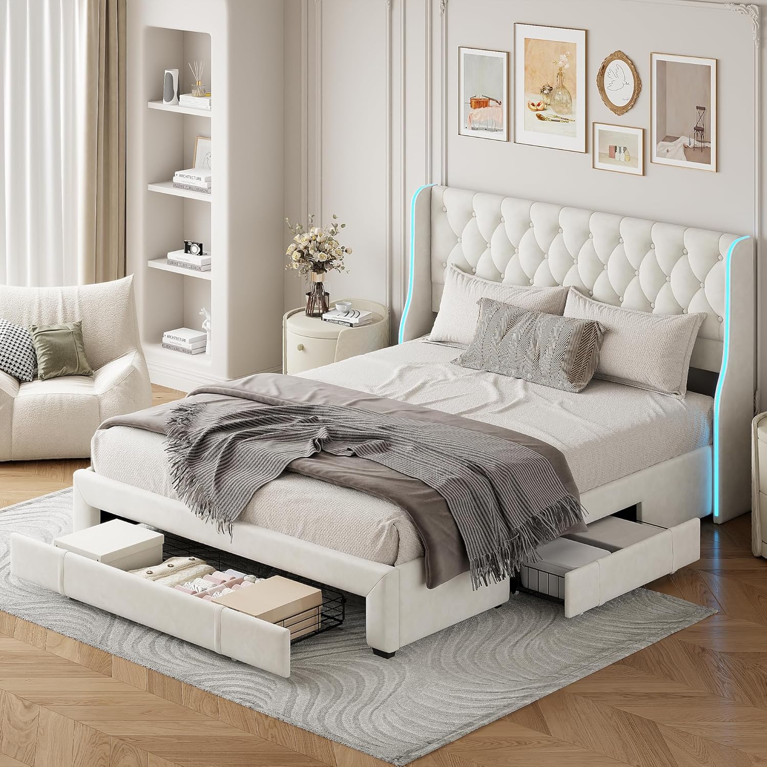 DULRLLY Lit Double Rembourré 140x200 avec LED et Rangement, Lit Coffre 2 Places avec 4 Tiroirs, Tête de Lits Capitonné, Cadre de Lits avec Sommier à Lattes pour Adultes et Adolescent