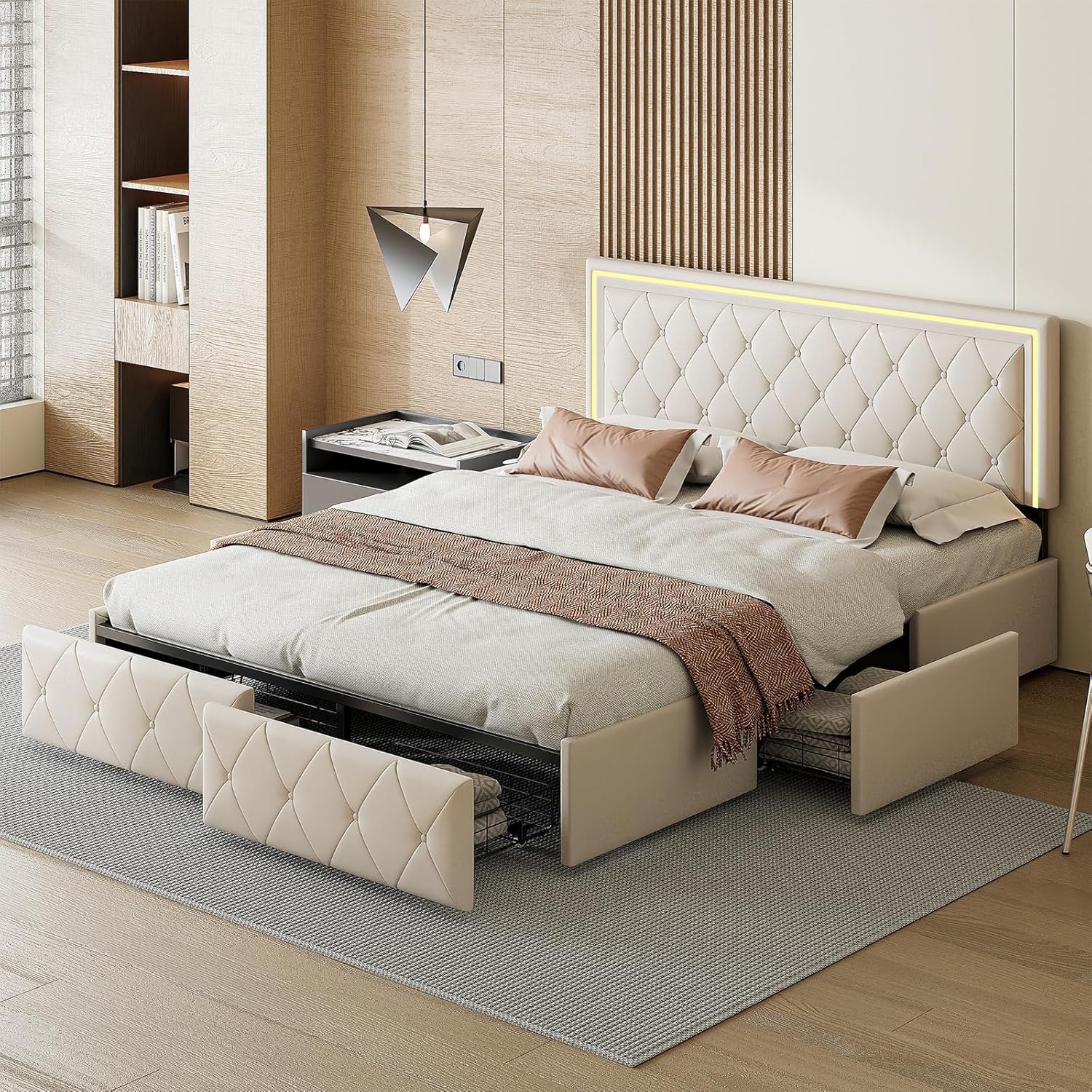 Callicarpa Cadre de Lit avec Tiroirs de Rangement, Lits LED 160 X 200, Lit Deux Place, lit Double, Lits et Cadre de Lit pour Adulte, Beige