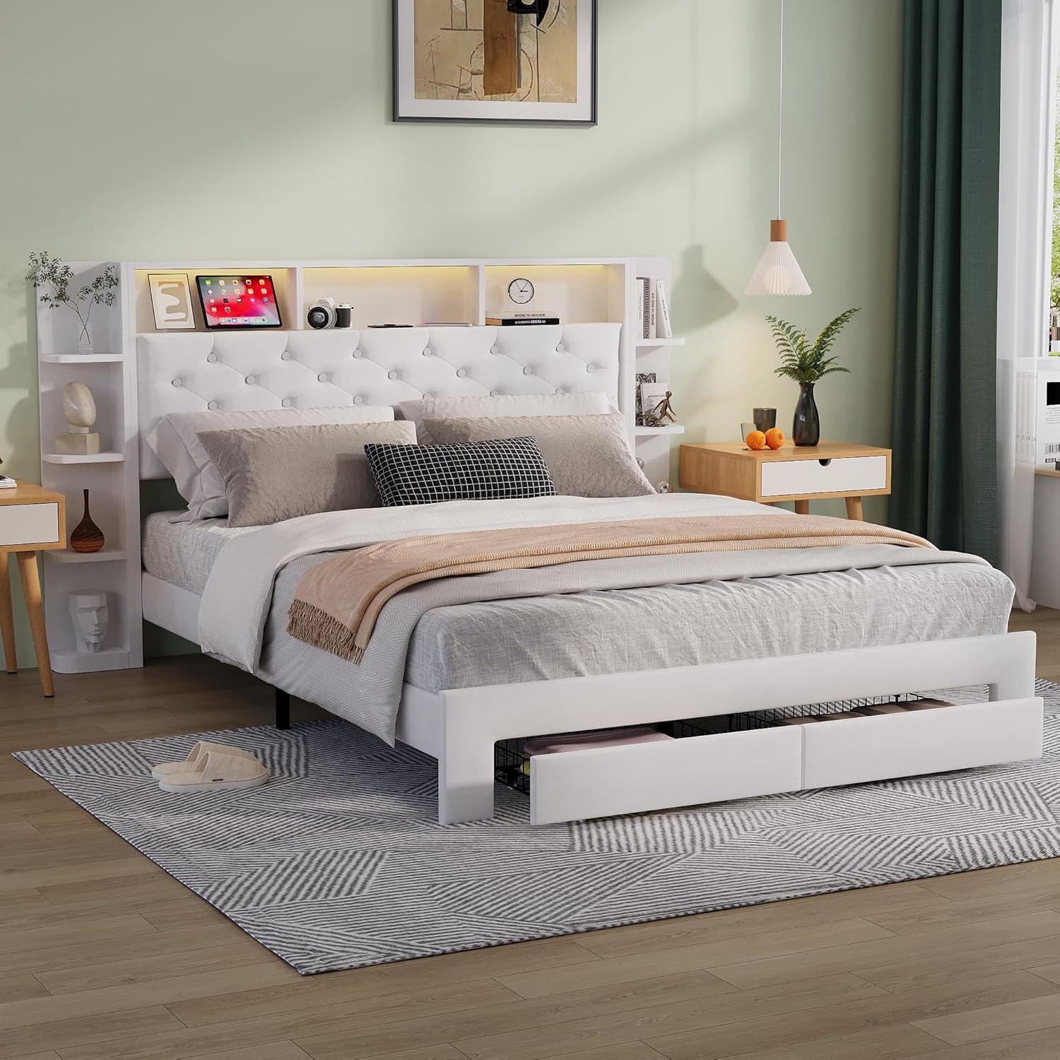 TDRTRD Lit 140x200 avec Sommier LED et USB, Lit Double Rembourré avec 4 Tiroirs, Tête de Lit avec Rangement, Lits 2 Personnes, Cadre de Lits Moderne pour Adultes Blanc, Velours, 140 x 200 cm