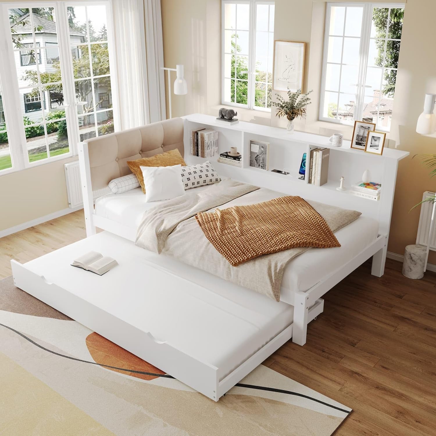 EURHCIO Canapé Lit 90x200,Cadre de Lit Une Place Rembourré avec Lit Gigogne 90x190,Port USB-C,Éclairage LED Réglable,Rangement,pour Adolescents Adultes 90x200
